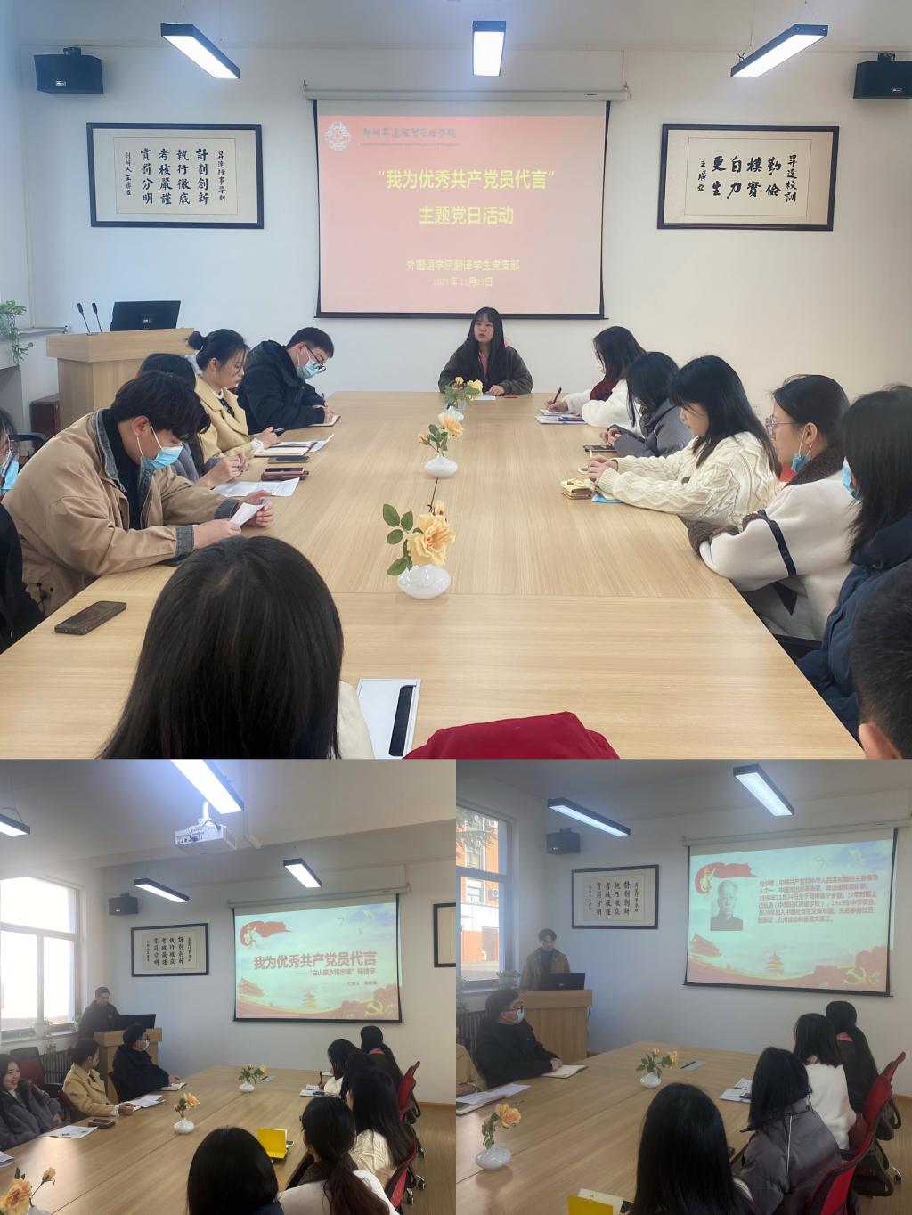 为继续深入学习贯彻落实习近平总书记在党史学习教育动员大会上的重要讲话精神,进一步增强对中国共产党发展历史的了解,激发爱党爱国热情,营造全面深入开展党史学习教育的浓厚氛围。11月29日中午12点30,太阳成集团tyc33455cc翻译本科员工党支部在教一楼206会议室开展了“我为优秀共产党员代言”主题党日活动。