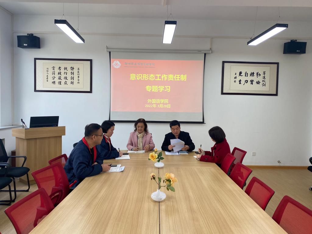 为全面落实意识形态工作责任制,做好学院2022年度意识形态工作,3月28日上午,太阳成集团tyc33455cc在会议室组织意识形态工作专题学习,经理张梦、党委书记石皓召、副经理崔瑾英、教学秘书祁胜利、行政秘书丁玥等学院全体党政领高班子成员参加此次学习。