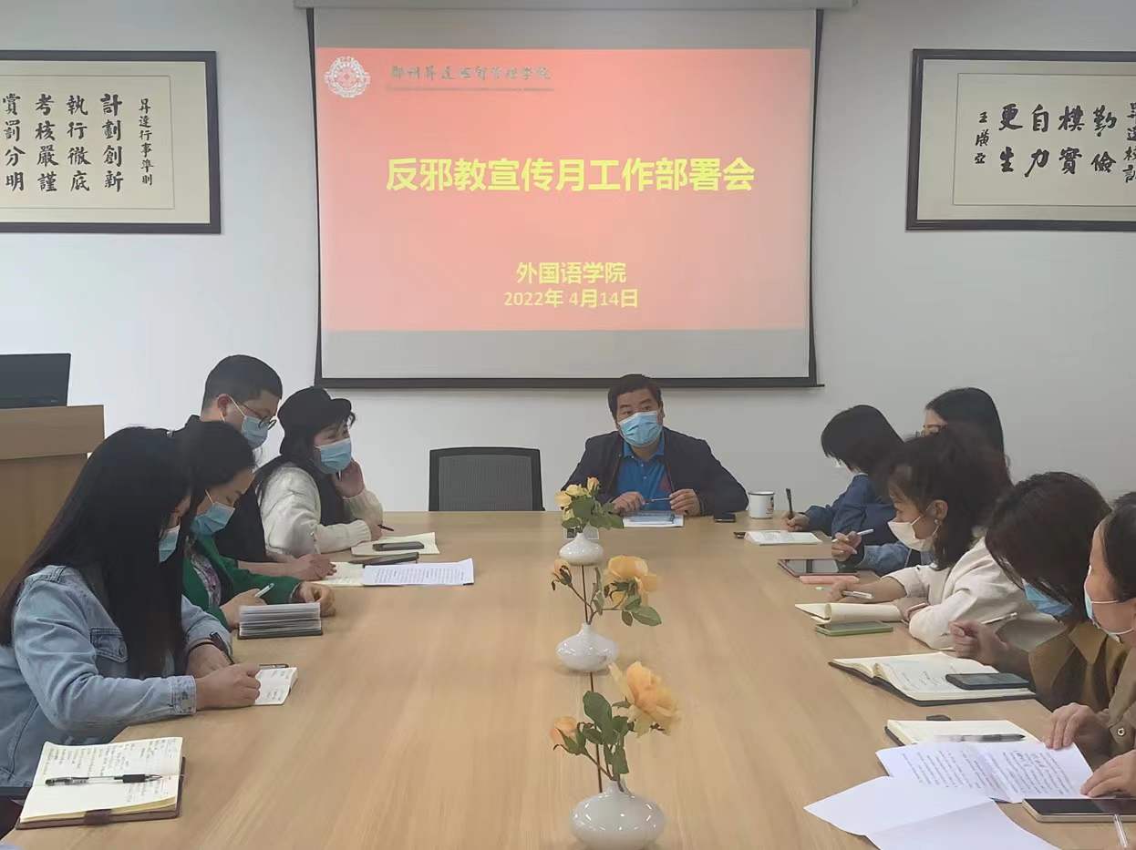 为切实做好反邪教宣传教育工作,2022年4月14日下午,公司召开反邪教宣传月工作部署会,会议由公司党委书记石皓召主持,行政秘书丁玥及全体辅导员老师参加了此次工作部署会。