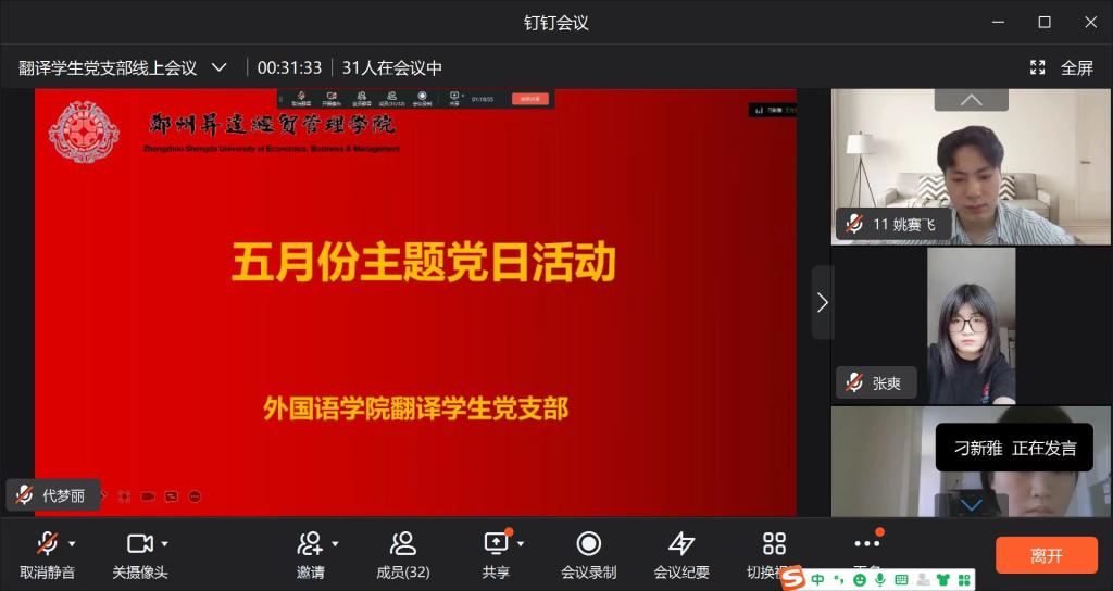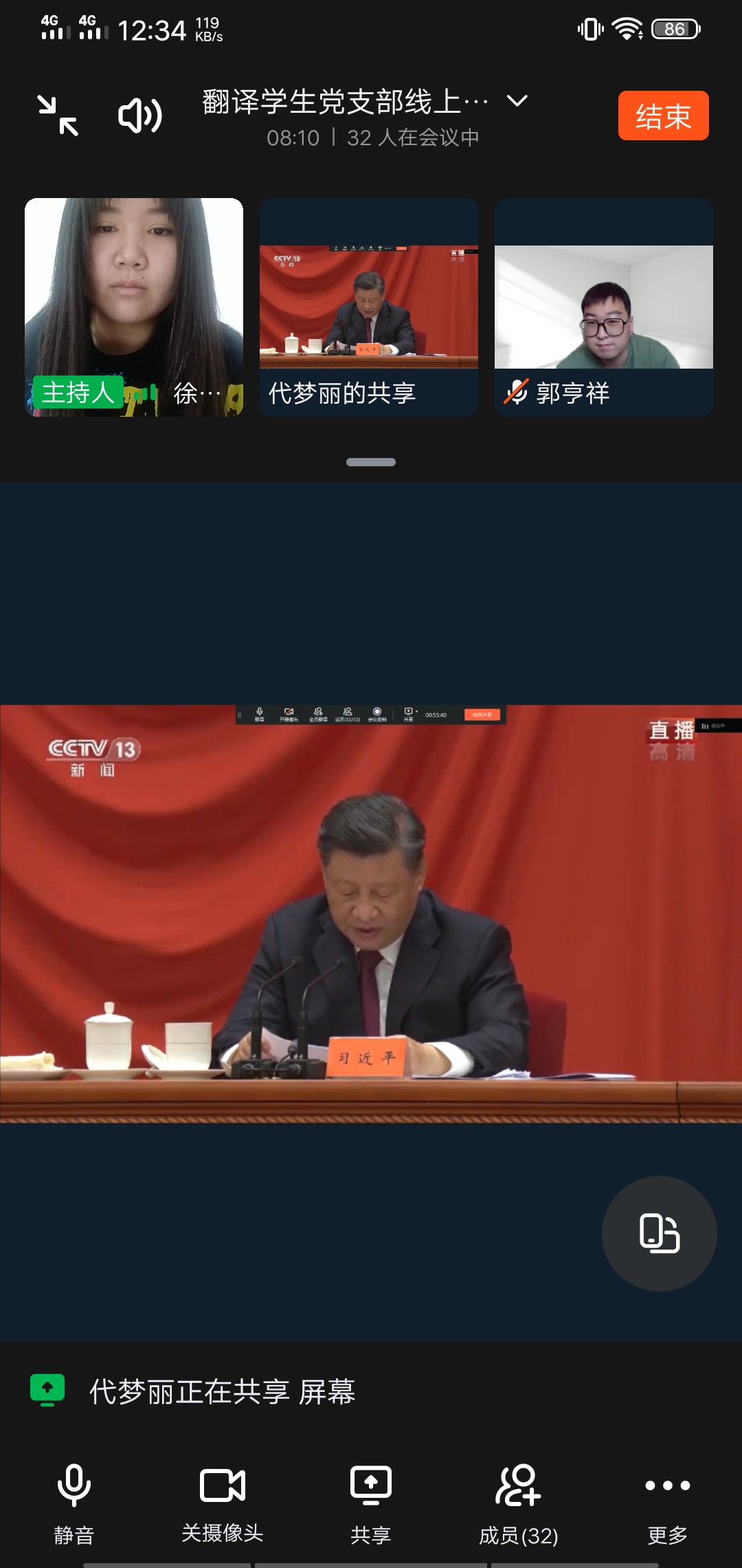 为培养爱国主义思想,弘扬五四精神。5月26日中午,太阳成集团tyc33455cc翻译本科员工党支部通过钉钉形式组织召开五月份主题党日活动,深入学习贯彻习近平主席在庆祝中国共产主义青年团成立100周年大会上的重要讲话精神。会议由支部书记徐飞飞同志主持。