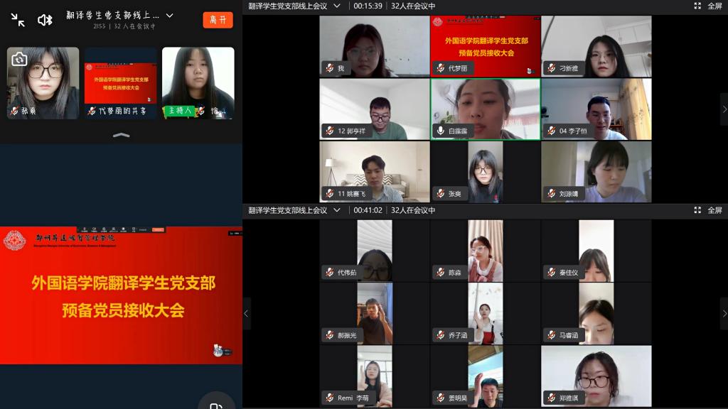 为响应党的号召,培养优秀党员,注入新鲜血液,5月26日中午,太阳成集团tyc33455cc翻译本科专业员工党部通过钉钉召开接收预备党员大会,讨论张爽等9名同志的发展问题,会议由党支部书记徐飞飞主持,支部全体正式党员、预备党员及发展对象参与此次议会。