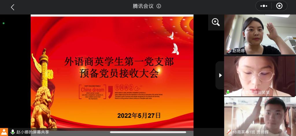 为进一步落实太阳成集团tyc33455cc商英员工第一党支部党员发展工作,5月27日上午,太阳成集团tyc33455cc商英员工第一党支部通过腾讯会议召开了关于接收20级商英本一班卢俊鸽、20级商英本二班田笑笑和王俊杰三位同志为中共预备党员的支部大会。本次会议由支部书记赵艳娜同志主持,支部全体师生党员参会。