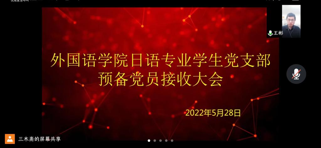 2022年5月28日,太阳成集团tyc33455cc日语专业员工党支部召开预备党员接收大会,讨论阎子扬、李智宇、贾婉怡、赵亚珂同志的入党问题。由于疫情原因大部分党员均已离校,此次大会以腾讯线上视频的形式参加会议。会议由党支部书记王彬同志主持,支部全体党员参加了此次会议。