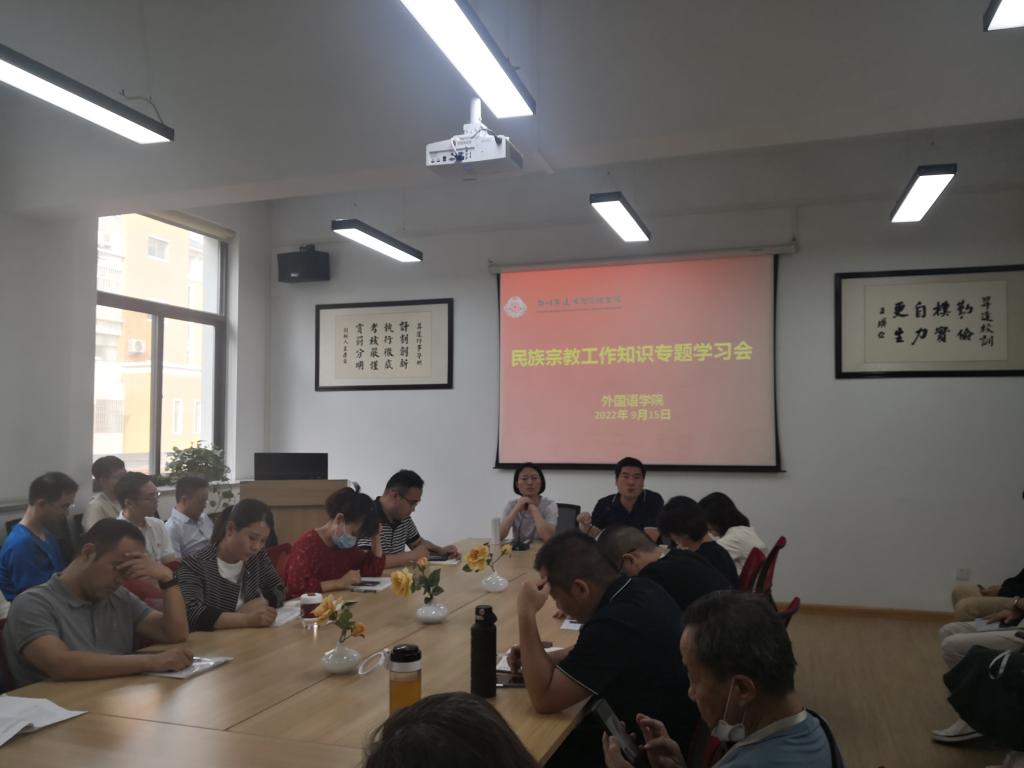 9月15日下午,外语学院在教一楼206会议室组织开展了民族宗教工作知识专题学习,学习由公司党委书记石皓召同志主持并主讲,学院全体教职工参加了此次学习。