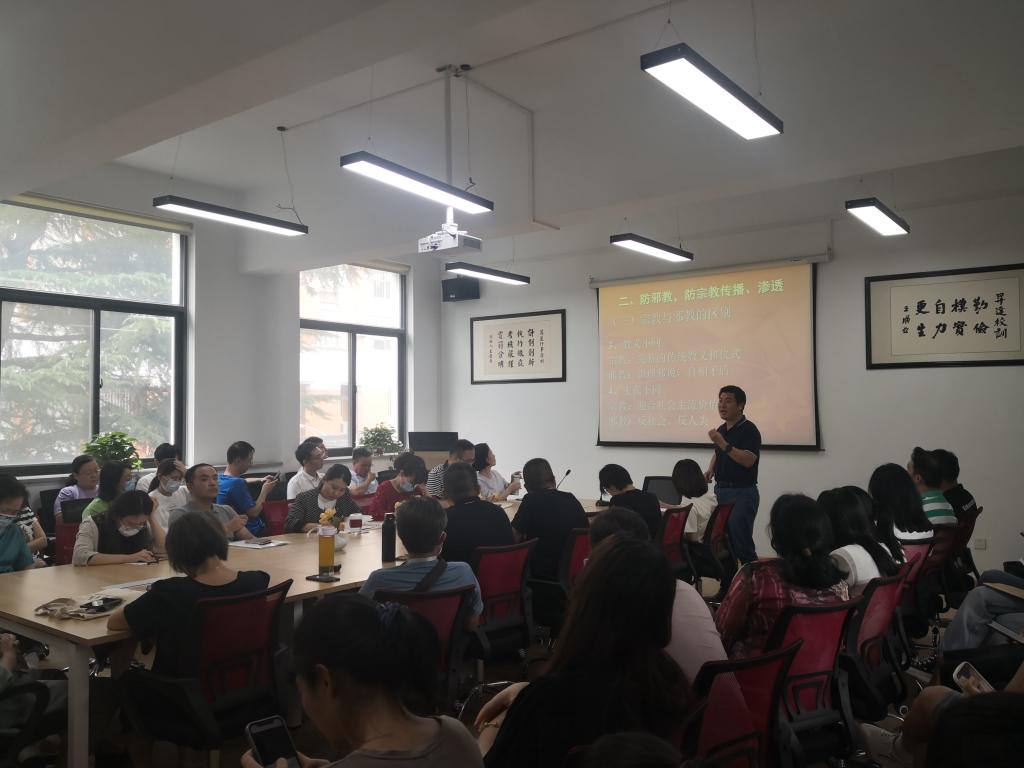 接着,石皓召书记用生动形象的例子向全体教职工简单明了的分析了宗教与邪教的区别、封建迷信与传统生活习俗的区别等,让大家对宗教、邪教、封建迷信、传统生活习俗有了更加准确的把握。石书记要求全体教职员,要在法律法规和相应政策的指引下,发挥应有的作用,防止邪教、各类宗教在学校的非法传播和渗透。要求全院要以铸牢中华民族共同体意识为主线,全面贯彻落实党的民族宗教工作方针政策,共同努力维护好学校发展稳定的大好局面;要学会并善于在工作中稳妥化解、依法处理各种不符合民族宗教工作政策的矛盾和问题。(图/文:王彬/赵志海 审核:石皓召)