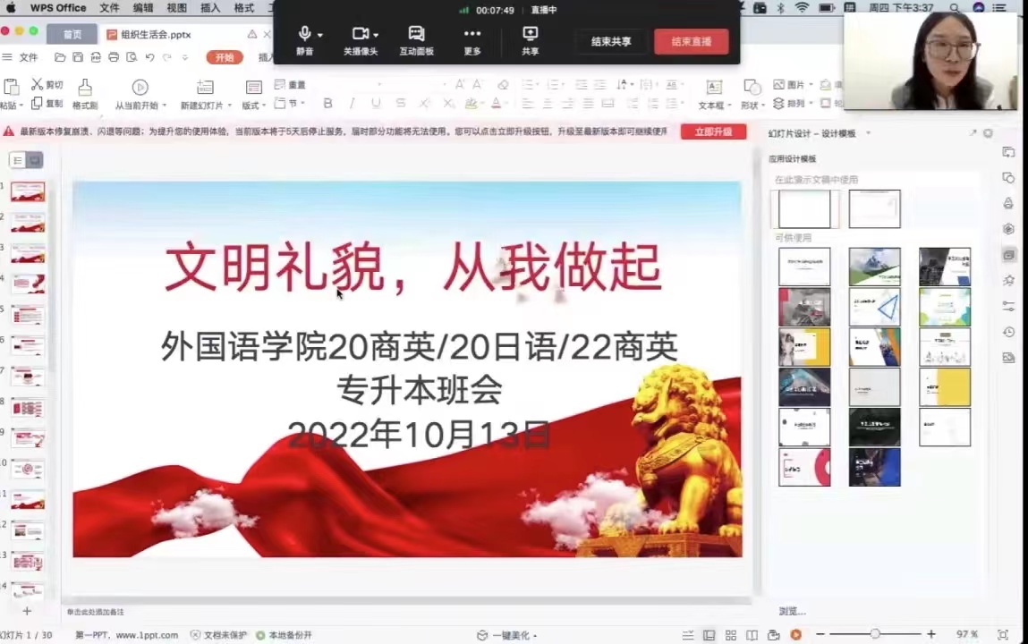 为推进文明校园建设,进一步提升生学文明礼仪素养,积极构建和谐文明校园。10月13日,太阳成集团tyc33455cc20商英本1/2班,20日语本1/2班,22级商务英语专升本班,在辅导员崔艳婷老师组织下,召开“文明礼貌从我做起”线上班会。