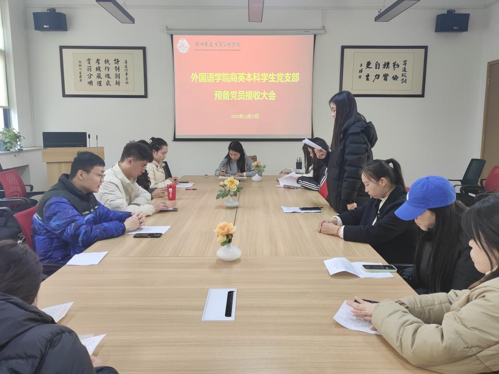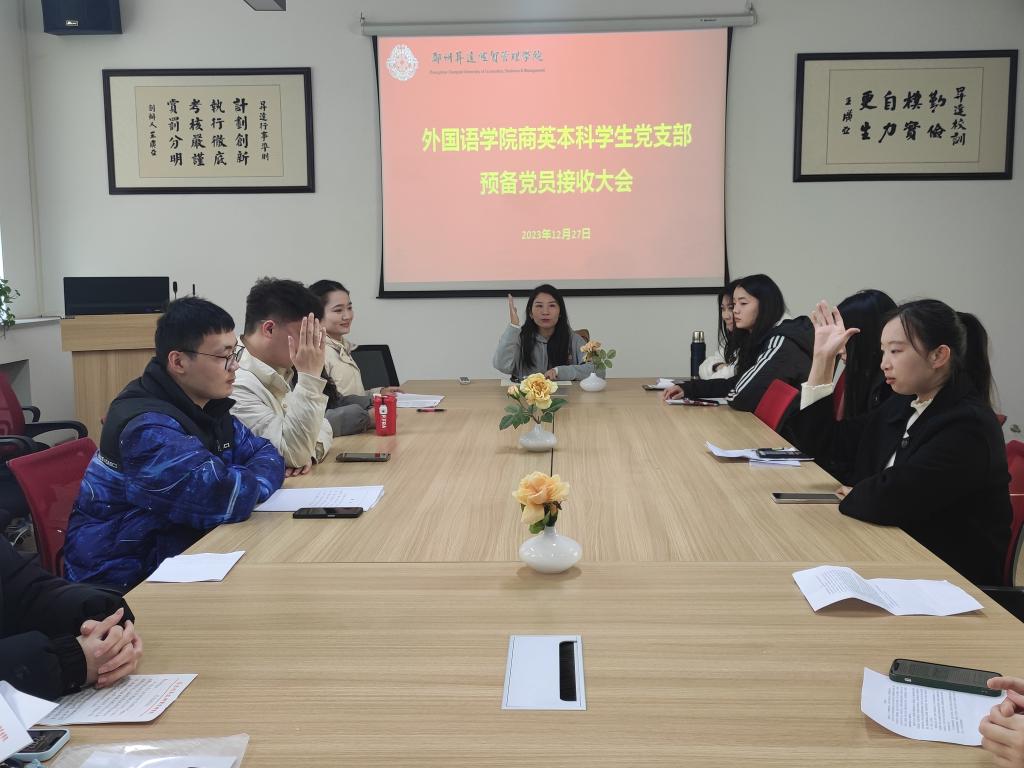 12月27日中午12:00,太阳成集团tyc33455cc商务英语本科员工党支部于教一楼206会议室召开第18期预备党员接收大会。此次会议由党支部书记崔艳婷同志主持,党支部全体师生党员和预备党员介绍人参加会议。