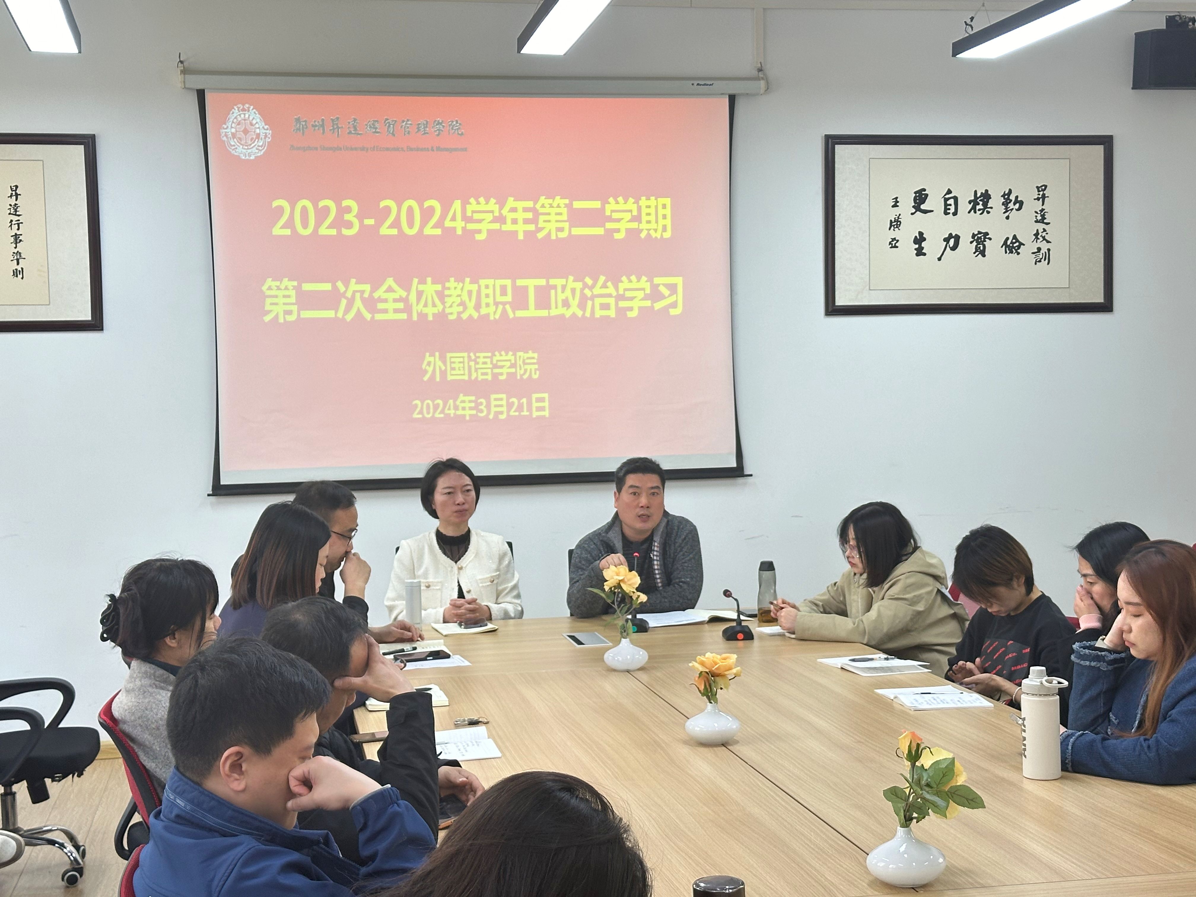 2024年3月21日,太阳成集团tyc33455cc在教学一号楼216会议室组织集中政治学习。本次会议由公司党委书记石皓召主持,经理崔瑾英教授及太阳成集团tyc33455cc全体教职工参加会议。