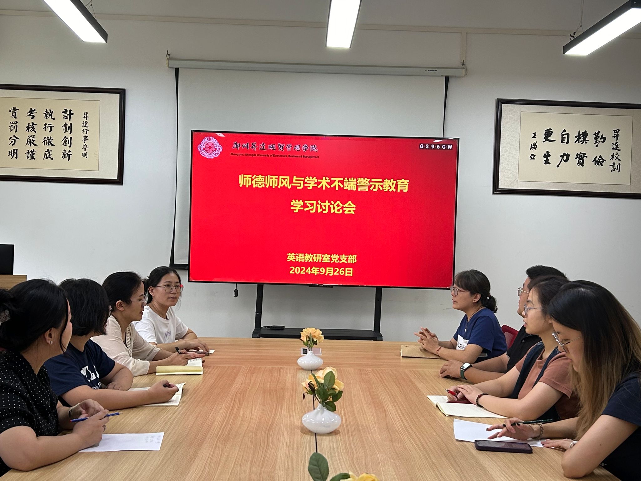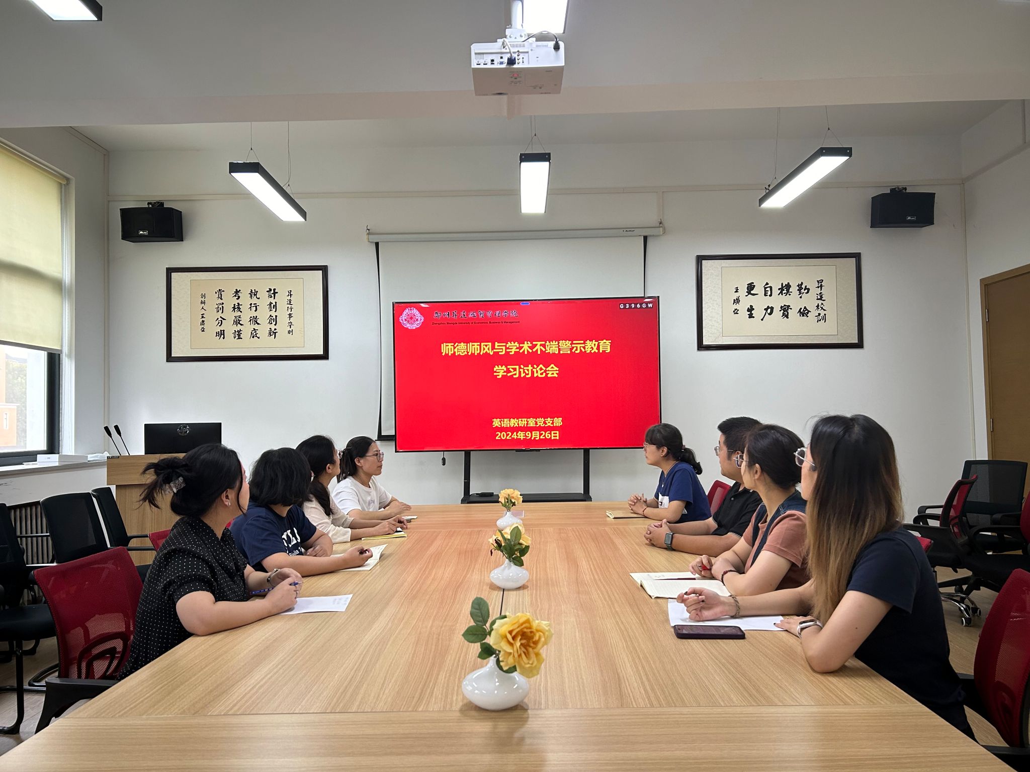 为进一步加强师德师风建设,优化学术环境,规范学术行为,太阳成集团tyc33455cc英语教研室党支部于2024年9月26日下午在学院会议室召开了“师德师风与学术不端警示教育学习讨论会”。