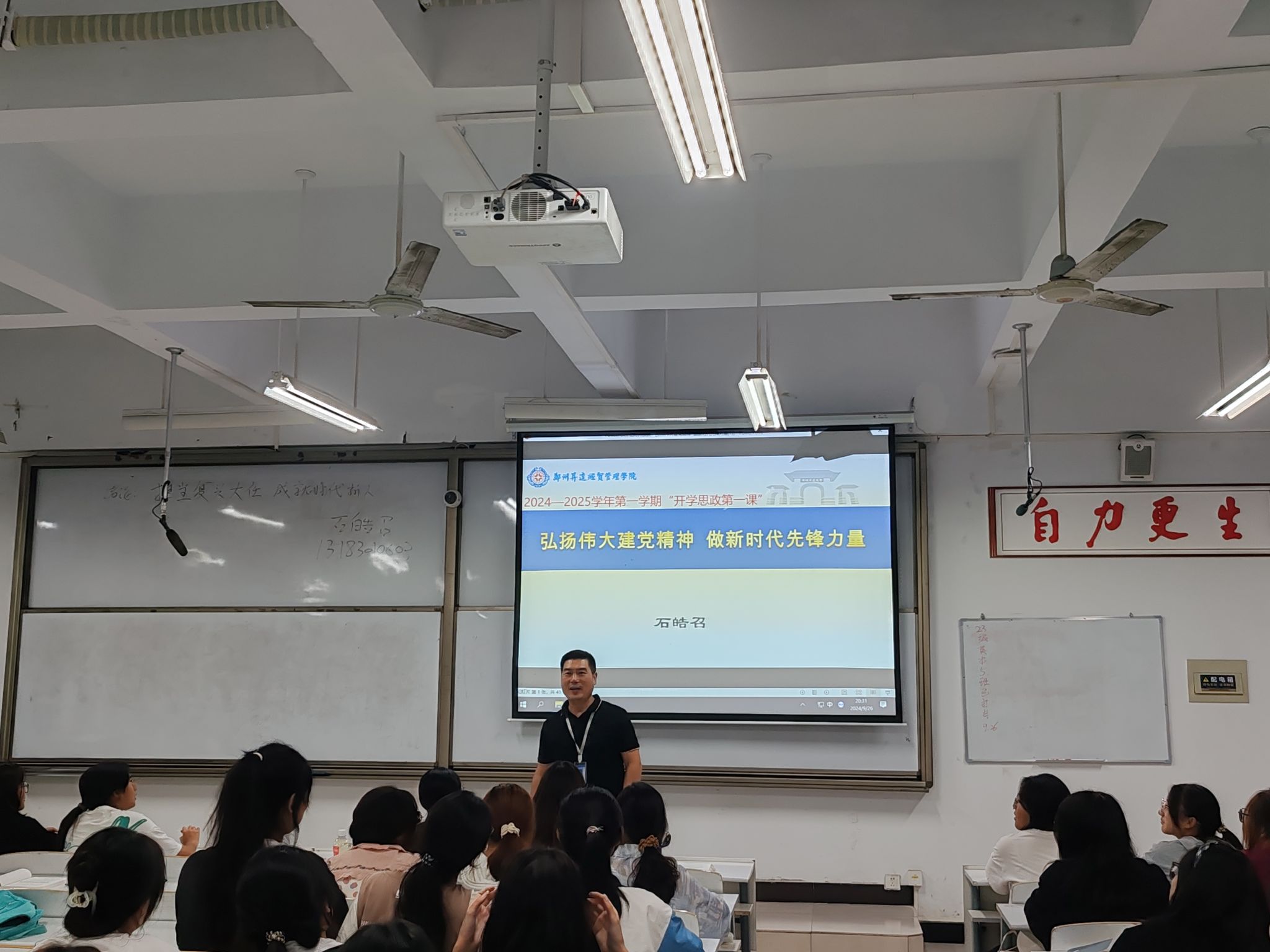 2024年9月26日晚,按照公司党委的统一工作部署,公司党委书记石皓召同志,在教学楼内为2024级英语本科三、四班的同学们带来了秋季学期的第一堂思政课——《弘扬伟大建党精神 做新时代先锋力量》。此次授课旨在深化员工对中国共产党历史的理解,激发其爱国情怀与奋斗精神,为新学期的学习生活奠定坚实的思想基础。
