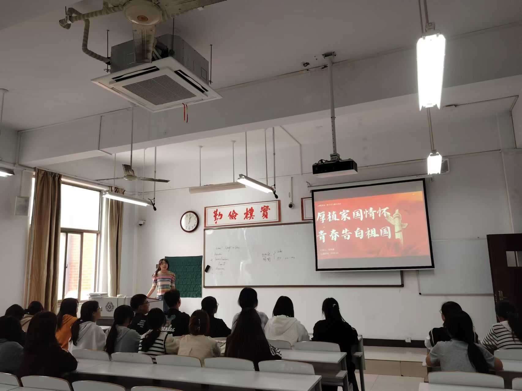 2024级英语本科3班团支部于2024年10月12日在道镕楼202教室积极组织开展了“厚植家国情怀——青春告白祖国”专项主题团日活动。活动的组织工作准备充分。在活动开始前,负责人详细制定了活动流程,明确了每个环节的时间和内容。活动中,引导同学们参与,鼓励大家发表自己的意见和建议。在游戏环节严格要求同学们遵守规则,确保了活动的公平公正。 活动后,同学们撰写总结,深刻的体会了厚植家国情怀,青春奋斗的重要性,积极做一个踏实向上,根正苗红的好青年。