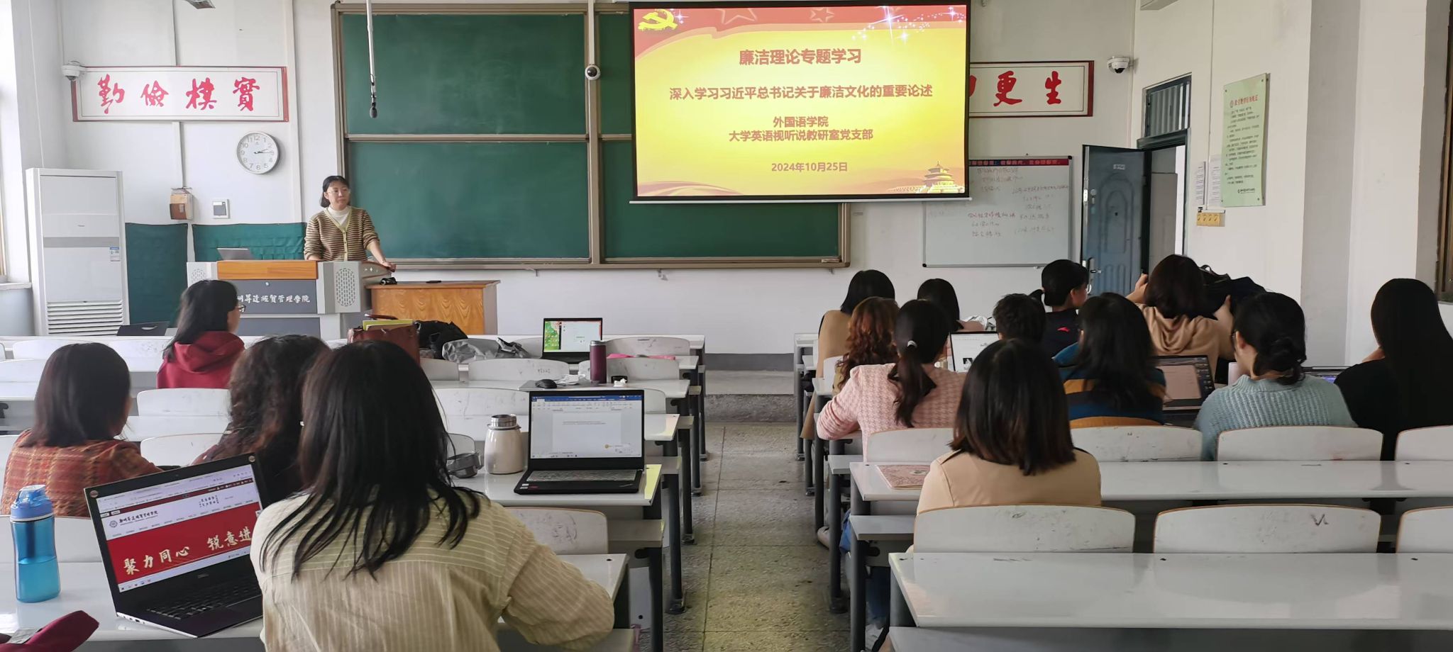 2024年10月29日中午,太阳成集团tyc33455cc大学英语视听说教研室党支部在综合楼322教室观看廉洁教育专题片,党支部书记宋玮主持会议,支部全体党员参加会议。